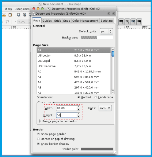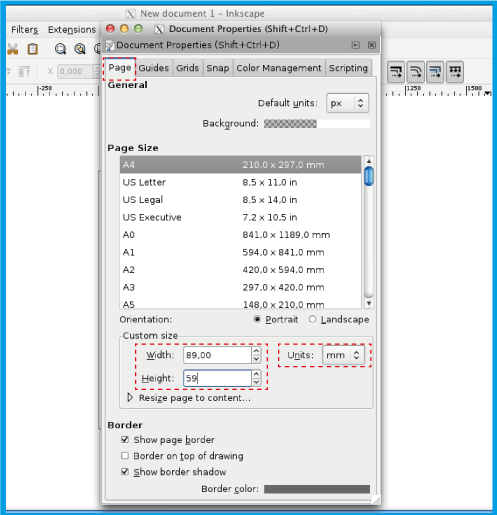 .Certífiquese que añade 4mm (0,4cm) a la altura y ancho de su archivo. En el caso de una tarjeta de presentación con 8,5x5,5cm, coloque 8,9x5,9cm.